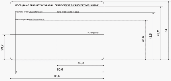 зона VI. Одной строкой напечатано надпись “СВИДЕТЕЛЬ ЕСТЬ СОБСТВЕННОСТЬЮ УКРАИНЫ CERTIFICATE IS THE PROPERTY OF UKRAINE”, ниже последовательно сверху вниз напечатано названия полей :